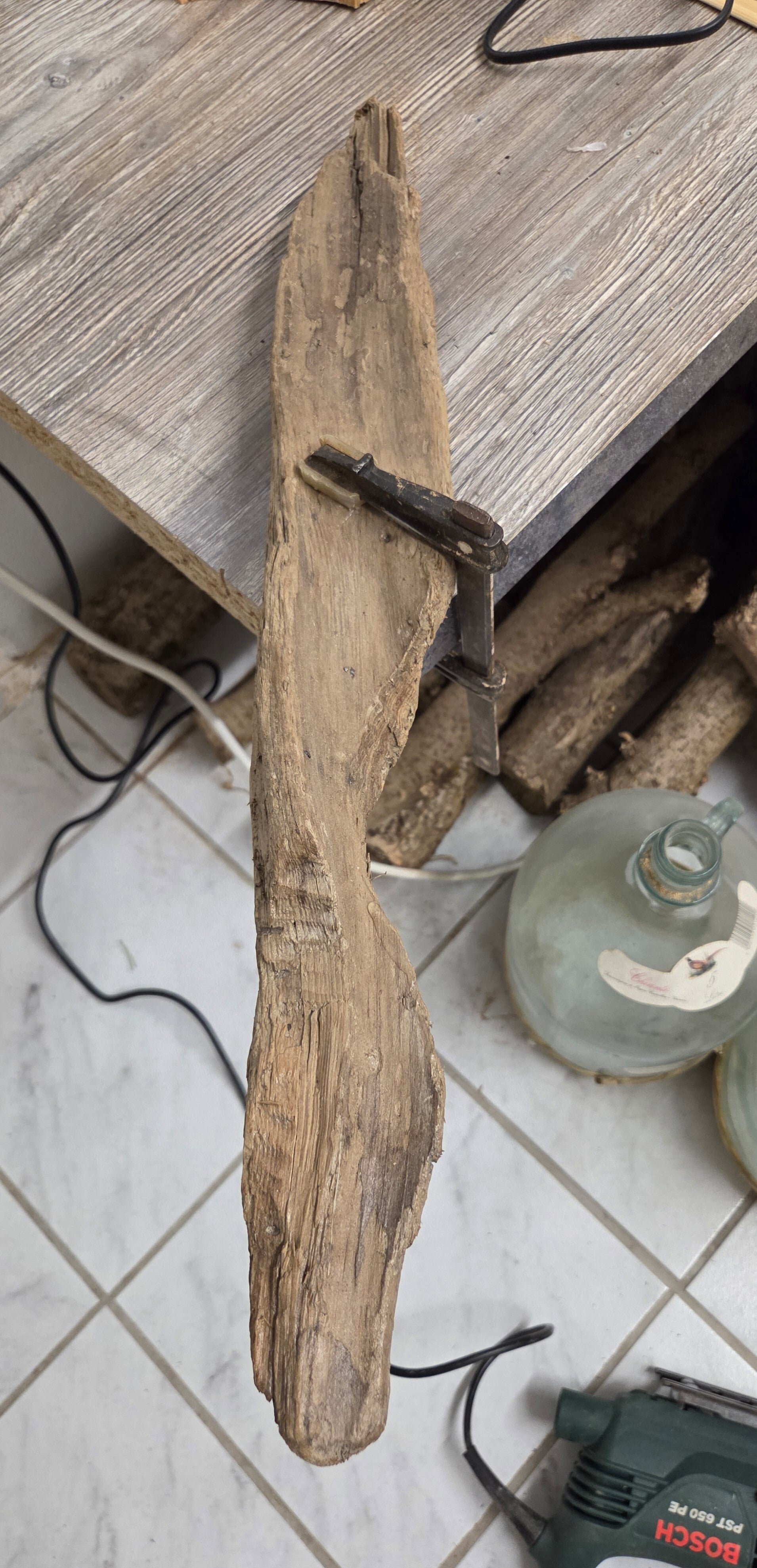 Ich bin mir nicht sicher, ob das hier blogtauglich ist – schließlich mache ich so etwas zum ersten Mal. Aber ich möchte euch trotzdem von meinem kleinen DIY-Projekt erzählen, das mich heute ganz begeistert hat. Ich habe ein Stück Schwemmholz genommen und es mit einer Stichsäge in die gewünschte Form gebracht. Danach habe ich eine passende Holzscheibe ausgewählt, die als Standfuß dienen sollte. Diese habe ich sorgfältig abgeschliffen, um eine glatte und ansehnliche Oberfläche zu erhalten.